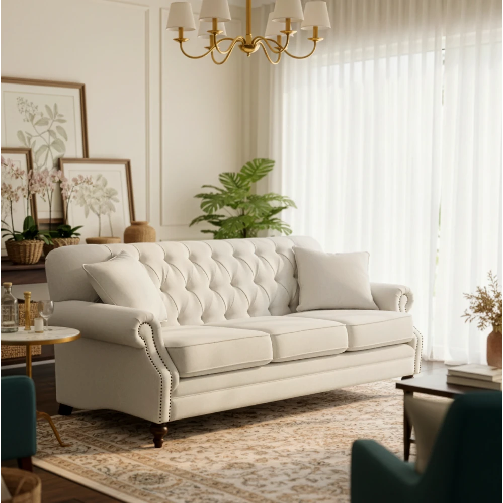 Elevate your living room decor with our exquisite Lowery 3 Seater Sofa. Its polyester fabric offers a cotton feel that is both inviting and durable. The diamond tufted backrest, high rolled arm with nailheads and turned-style legs create a classic yet stylish look that is sure to impress your guests. It has angled seating, resulting in a downward slope towards the back of the sofa that gives a deeper and comfortable seating position. Made with sturdy pinewood and plywood, this sofa is built to last.